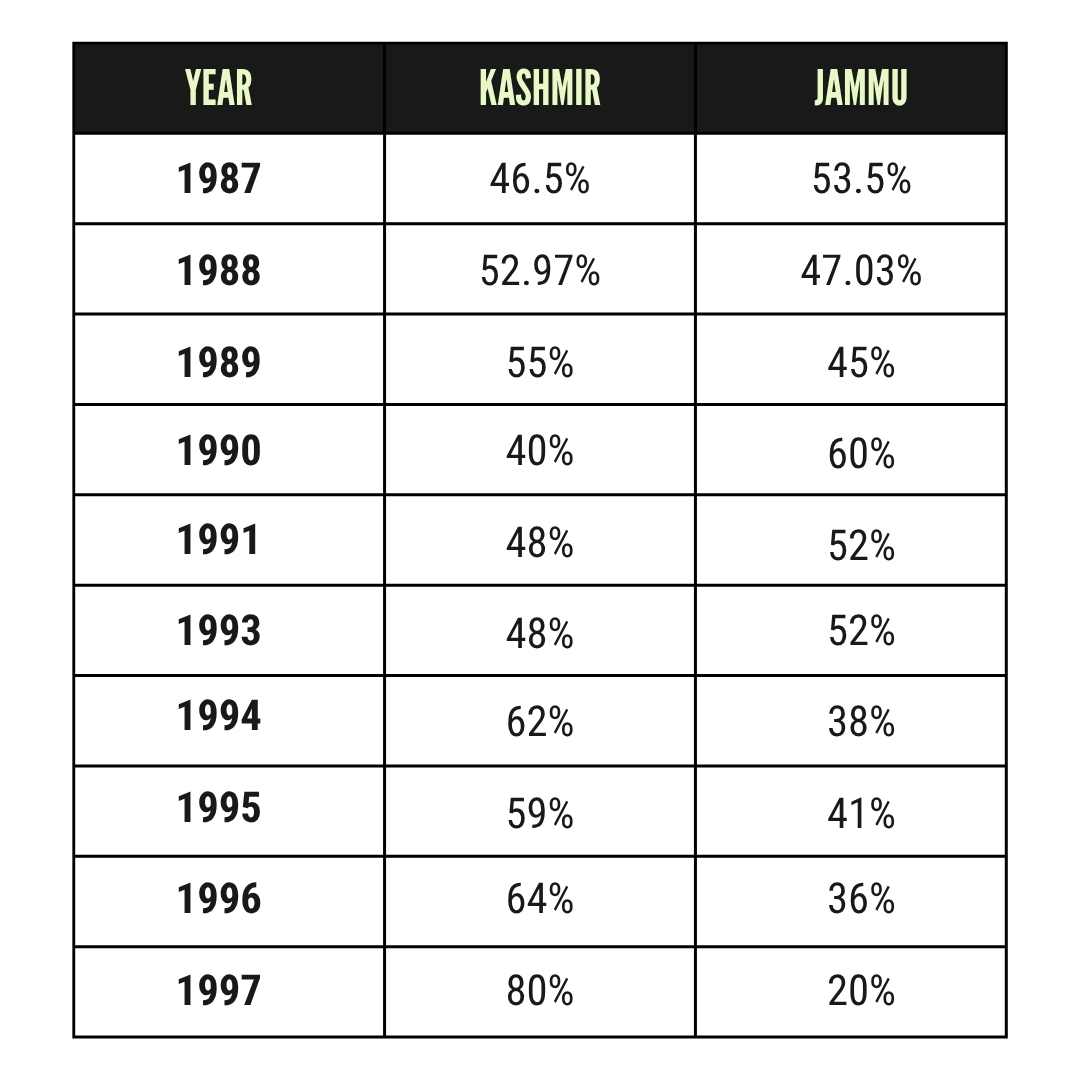 Ratio of Kashmiris and Jammu people in selections for admission to MBBS colleges 1987-1997