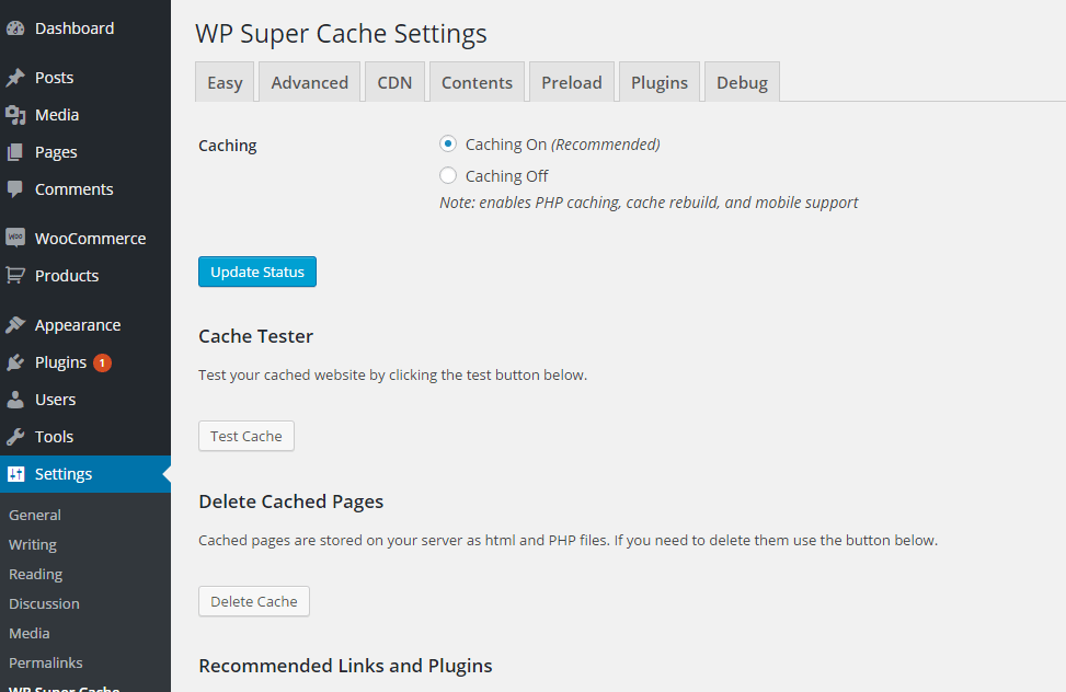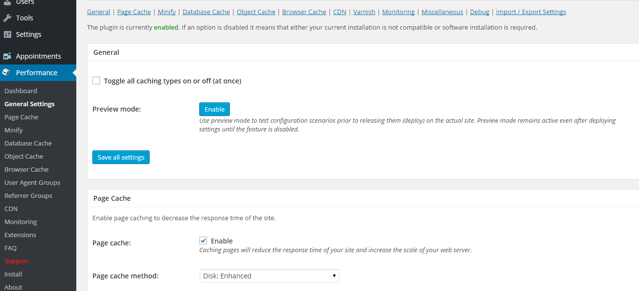 This is how the W3 Total Cache plugin’s General Settings page looks like: